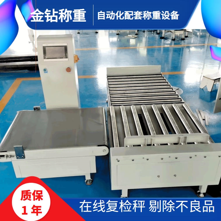 自动称重: 产品在流水线上通过高精度动态检重秤。